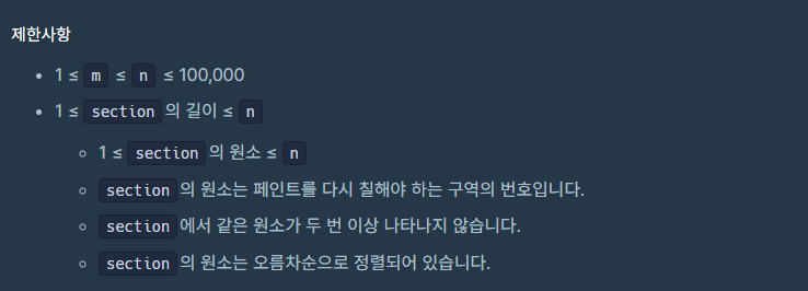 정수 n, m과 다시 페인트를 칠하기로 정한 구역들의 번호가 담긴 정수 배열 section이 매개변수로 주어질 때 롤러로 페인트칠해야 하는 최소 횟수를 return 하는 solution 함수를 작성해 주세요.
