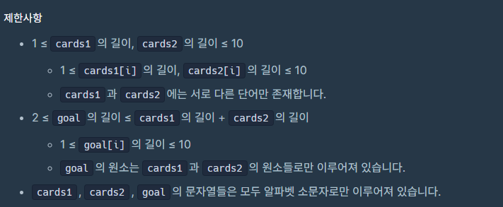 문자열로 이루어진 배열 cards1, cards2와 원하는 단어 배열 goal이 매개변수로 주어질 때, cards1과 cards2에 적힌 단어들로 goal를 만들 있다면 "Yes"를, 만들 수 없다면 "No"를 return하는 solution 함수를 완성해주세요.