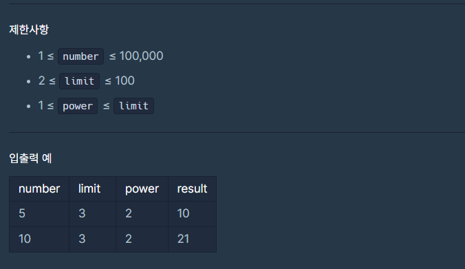 기사단원의 수를 나타내는 정수 number와 이웃나라와 협약으로 정해진 공격력의 제한수치를 나타내는 정수 limit와 제한수치를 초과한 기사가 사용할 무기의 공격력을 나타내는 정수 power가 주어졌을 때, 무기점의 주인이 무기를 모두 만들기 위해 필요한 철의 무게를 return 하는 solution 함수를 완성하시오.