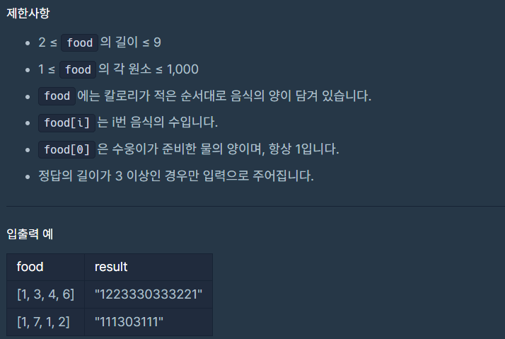 수웅이가 준비한 음식의 양을 칼로리가 적은 순서대로 나타내는 정수 배열 food가 주어졌을 때, 대회를 위한 음식의 배치를 나타내는 문자열을 return 하는 solution 함수를 완성해주세요.