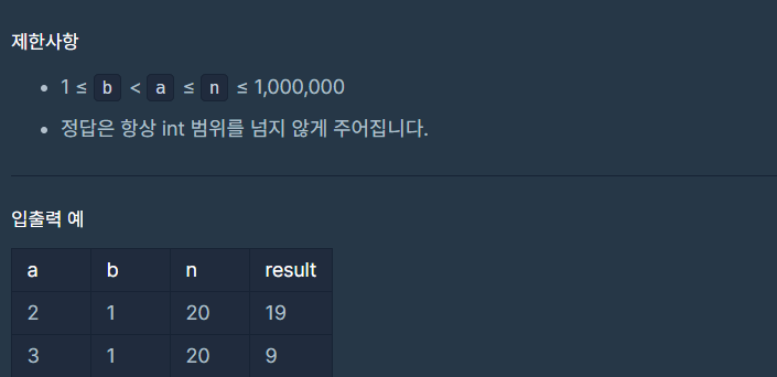 문제를 열심히 풀던 상빈이는 일반화된 콜라 문제를 생각했습니다. 이 문제는 빈 병 a개를 가져다주면 콜라 b병을 주는 마트가 있을 때, 빈 병 n개를 가져다주면 몇 병을 받을 수 있는지 계산하는 문제입니다. 기존 콜라 문제와 마찬가지로, 보유 중인 빈 병이 a개 미만이면, 추가적으로 빈 병을 받을 순 없습니다. 상빈이는 열심히 고심했지만, 일반화된 콜라 문제의 답을 찾을 수 없었습니다. 상빈이를 도와, 일반화된 콜라 문제를 해결하는 프로그램을 만들어 주세요.