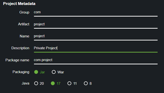 Packaging은 Jar를 선택한다. War를선택하면 Tomcat설치하고,, 뭐 이것저것 할게 많다. Java버전은 17로선택