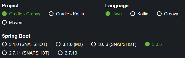 Language는 Java, Spring Boot버전은 김영한선생님 말씀이 괄호()가 없는 버전을 선택하라고 하셨다