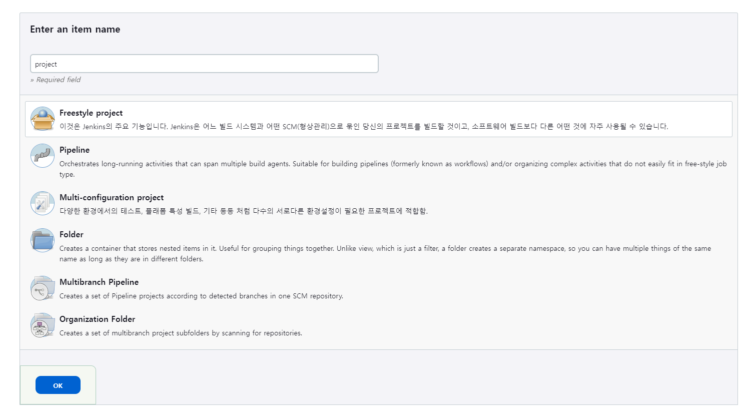 2. 이름을 입력하고, Freestyle project를 선택, OK버튼 클릭!