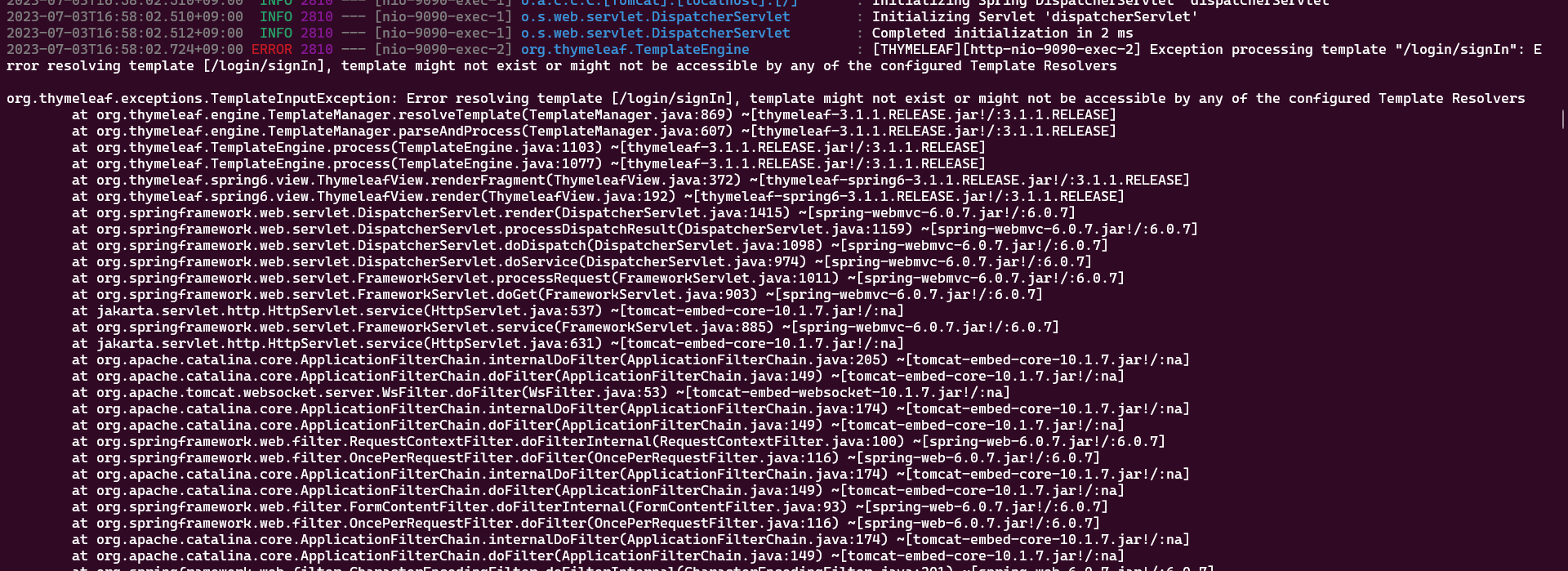 문제발생상황 회원가입버튼을 누르면 500에러가 발생. 로그를 확인해보니 Error resolving template “/fragments/footer”, template might not exist or might not be accessible by any of the configured Template Resolvers (template:
